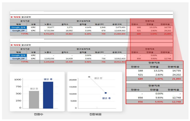 4. 광고결과 : 전체 DB수 증가, DB단가 45%이상 절감, 전환율 약 2배증가